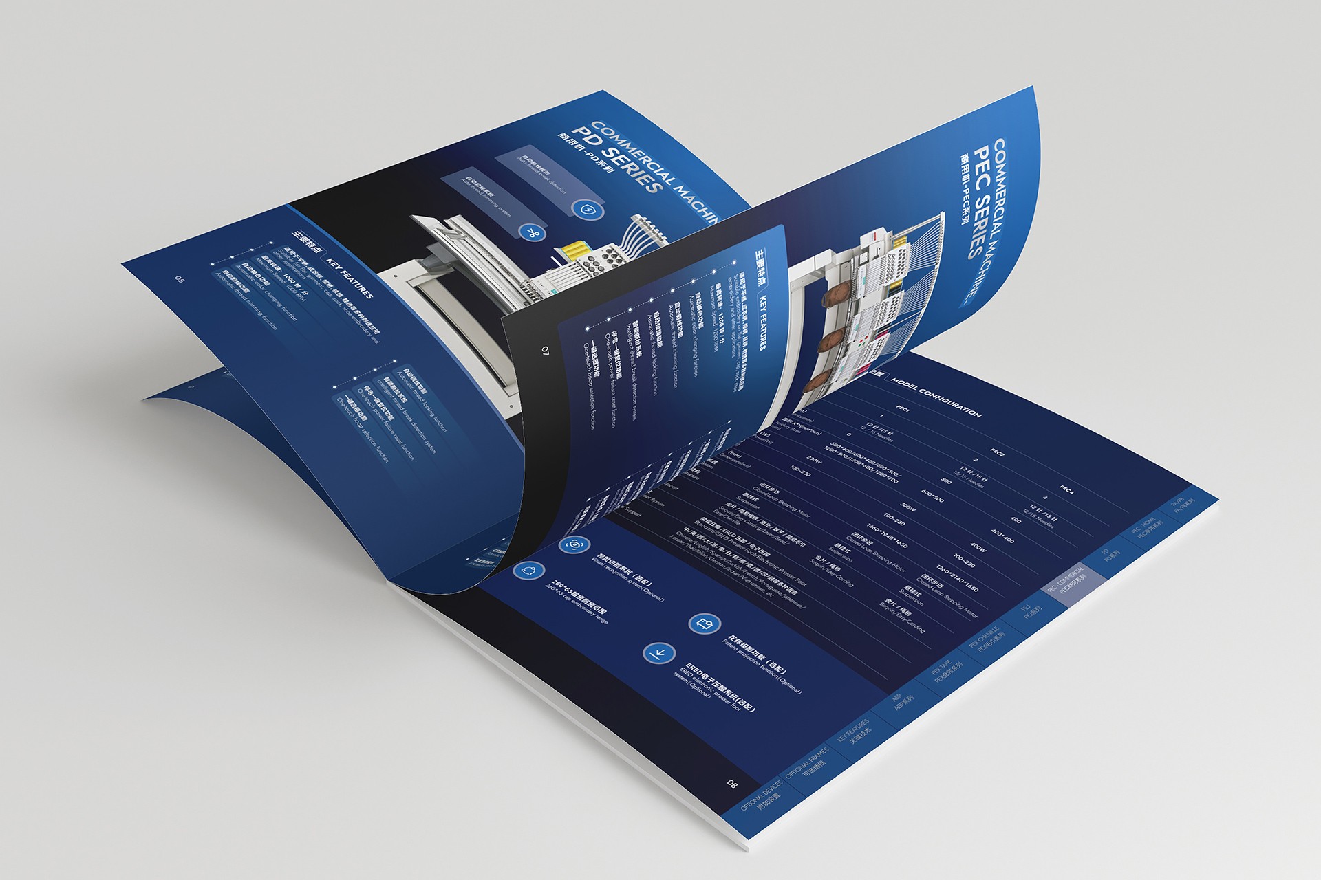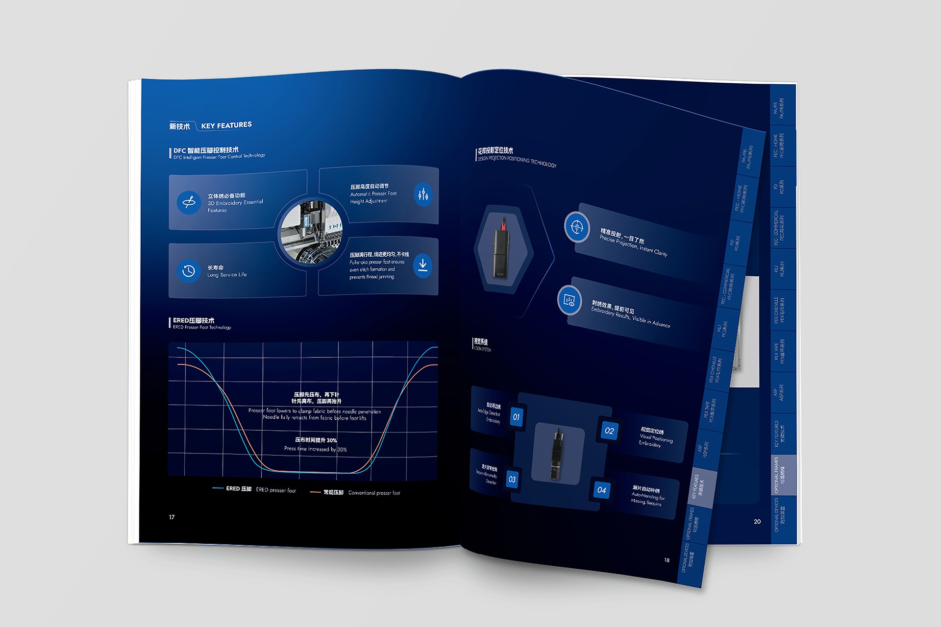 深色系工業(yè)美學(xué)視覺體系構(gòu)建: 開創(chuàng)性地采用深色背景(如深灰、墨藍(lán))作為畫冊主基調(diào)。這一選擇不僅凸顯了機(jī)械設(shè)備本身的金屬質(zhì)感與精密結(jié)構(gòu),更營造出專業(yè)、沉穩(wěn)、高端的視覺氛圍,在眾多競品畫冊中脫穎而出,極具記憶點(diǎn)。